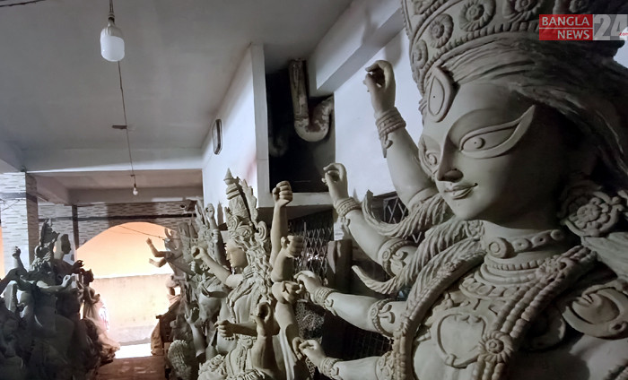 আর ৪০দিন পর হিন্দু সম্প্রদায়ের সর্ববৃহত ধর্মীয় উৎসব দুর্গা পূজা। এরই মধ্যে প্রতিমার কাঠামো তৈরি করা কাজ প্রায় শেষ পর্যায়ে। ছবি: উজ্জ্বল ধর