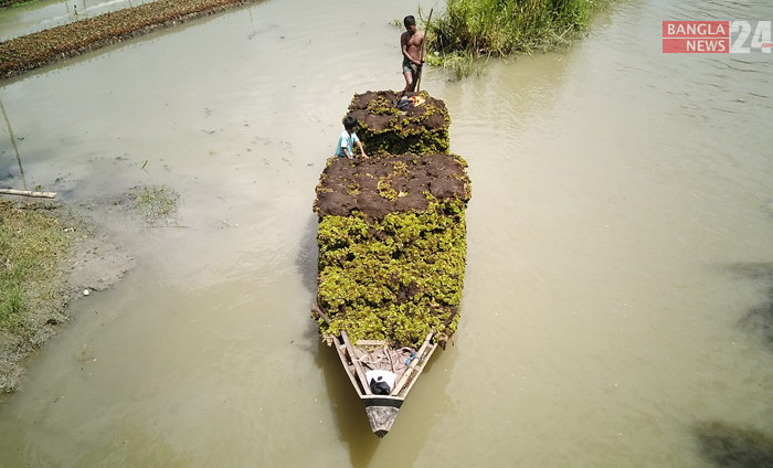 ভাসমান চাষাবাদের জন্য প্রয়োজনীয় দুলালী বন, শ্যাওলা ও ফ্যানা নৌকায় নিয়ে যাওয়া হচ্ছে। বরিশালের বানারীপাড়ার বিশারকান্দি থেকে ছবি তুলেছেন এন আমিন রাসেল