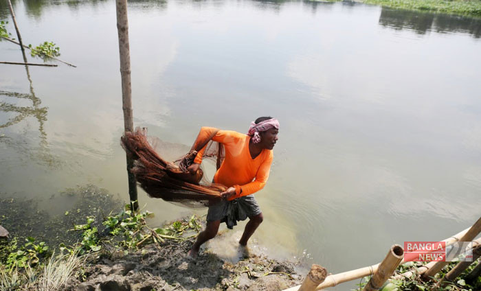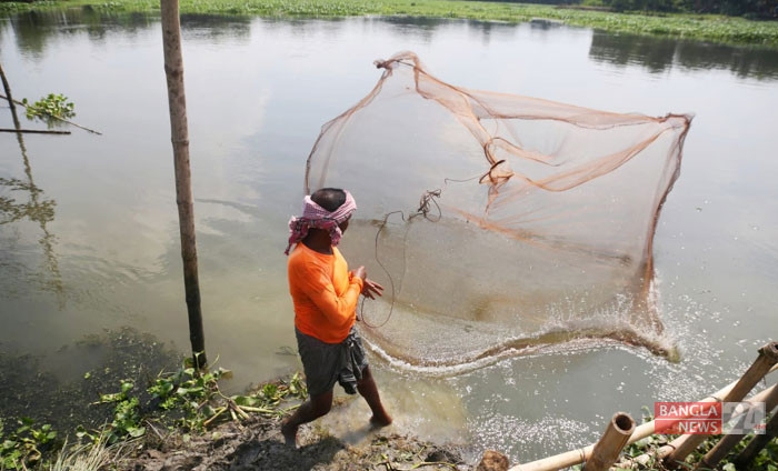 বর্ষায় জমে যাওয়া পানিতে জাল দিয়ে মাছ ধরায় ব্যস্ত এক জেলে। বেড়িবাঁধ এলাকা থেকে ছবি তুলেছেন ডিএইচ বাদল।