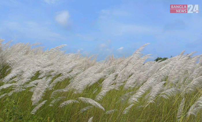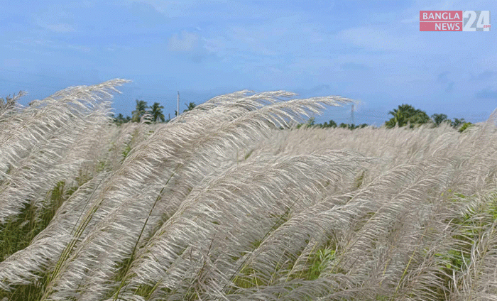 ‘সাদা ডালি’ সাজিয়ে দাঁড়িয়ে আছে কাশফুল। দক্ষিণা বাতাসে কাশফুলগুলো যেন ঢলে পরছে। ছবি: মাহবুবুর রহমান মুন্না।