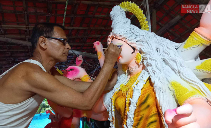 রং তুলির কাজে ব্যস্ত একজন প্রতিমা শিল্পী। ছবি: সোহেল সরওয়ার