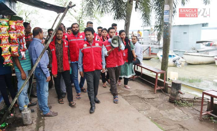 ঘূর্ণিঝড় ‘হামুন’ নিয়ে সতর্ক করতে উপকূলীয় এলাকায় প্রচারণা চালাচ্ছে স্বেচ্ছাসেবকরা। ছবি তুলেছেন এন আমিন রাসেল।