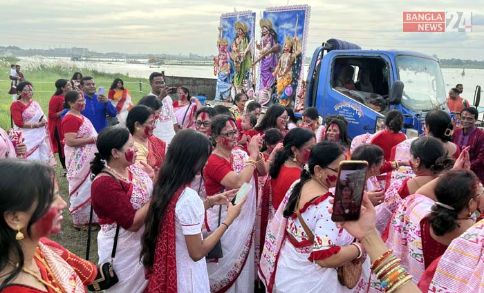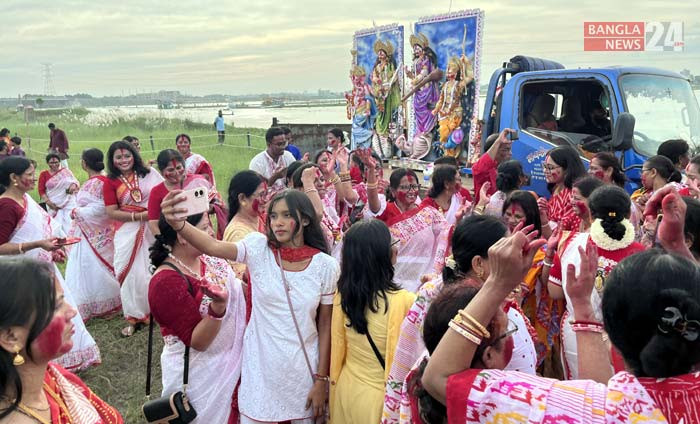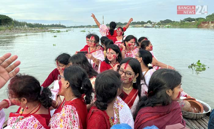 বিসর্জনের আগে সিঁদুর খেলা। তুরাগ নদীর পাশ থেকে ছবি তুলেছেন রাজিন চৌধুরী।