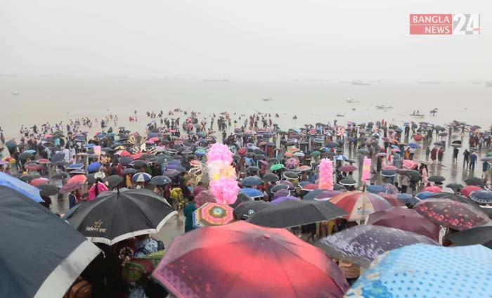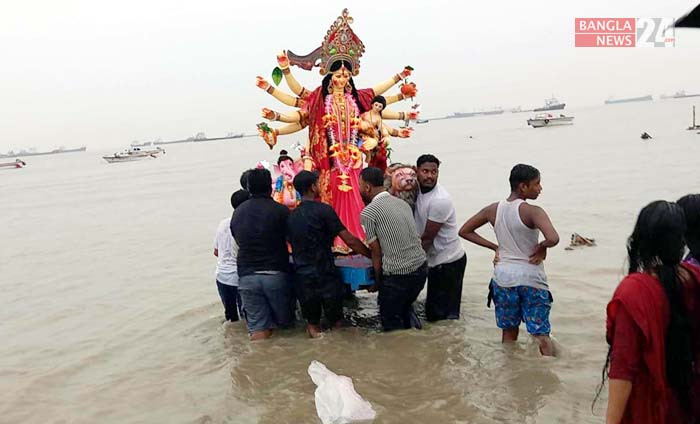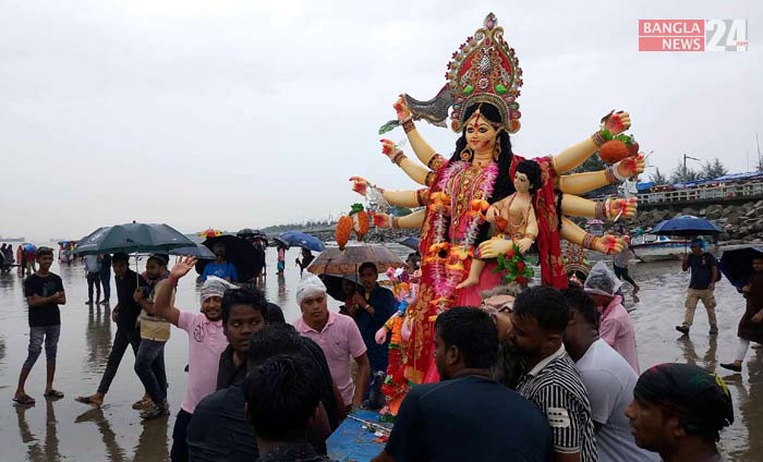 চট্টগ্রামের পতেঙ্গা সমুদ্র সৈকতে প্রতিমা বিসর্জন। ছবি: সোহেল সরওয়ার