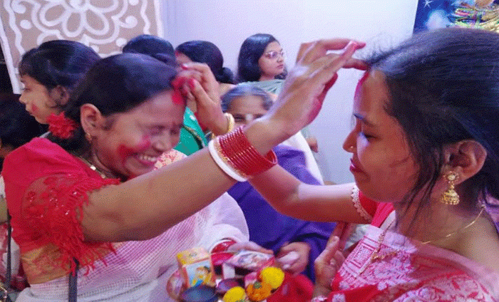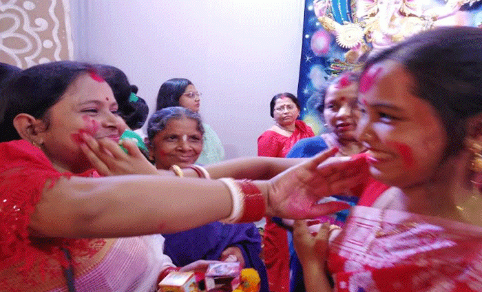 বরিশালের বিভিন্ন মণ্ডপে সিঁদুর খেলায় মেতে উঠেছে নারীরা। ছবি: এন আমিন রাসেল
