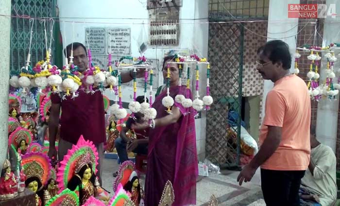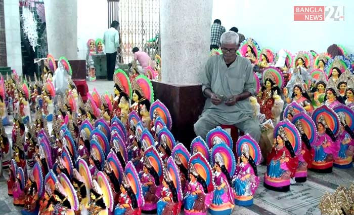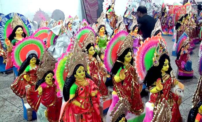 লক্ষ্মীর প্রতিমা, সরা ও উপকরণ নিয়ে বরিশাল নগরের হাটখোলার হরিমন্দিরে বসেছে মেলা। ছবি: মুশফিক সৌরভ।
