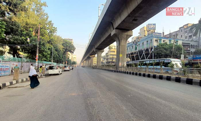 বিএনপি-জামায়াতের ডাকা ৭২ ঘণ্টা অবরোধের প্রথম দিনের শুরুতে মিরপুর ১১ নম্বর রাস্তার চিত্র। ছবি জি এম মুজিবুর।
