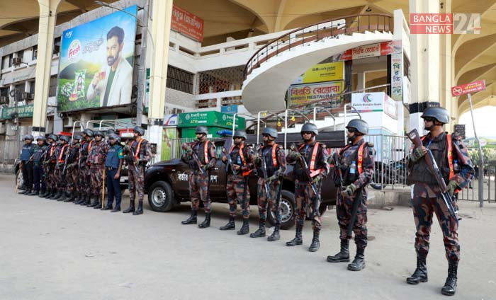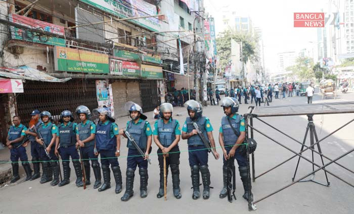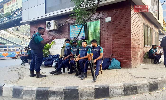 বিএনপি-জামায়াতের ডাকা ৭২ ঘণ্টা অবরোধের প্রথম দিনের শুরুতে মিরপুর ১০ নম্বর এলাকায় পুলিশের বাড়তি নিরাপত্তা। ছবি জি এম মুজিবুর।