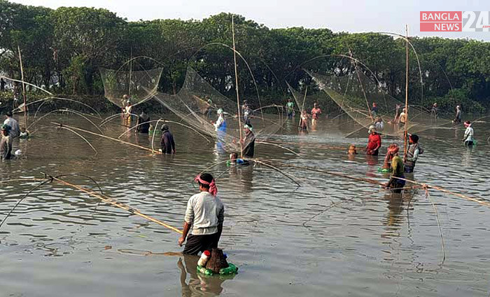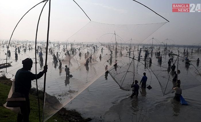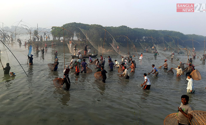 পাবনার চলনবিলে শুরু হয়েছে বাউত উৎসব। এ উৎসবে মেতেছেন দেশের নানা প্রান্ত থেকে আসা মৎস্য শিকারিরা। ছবি: মুস্তাফিজুর রহমান