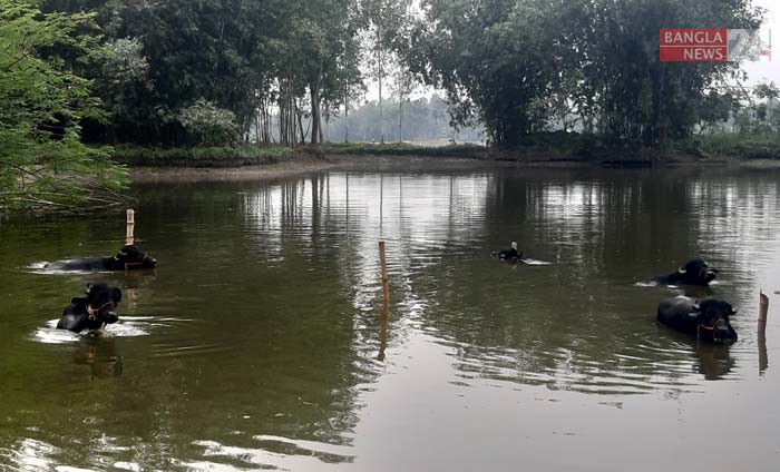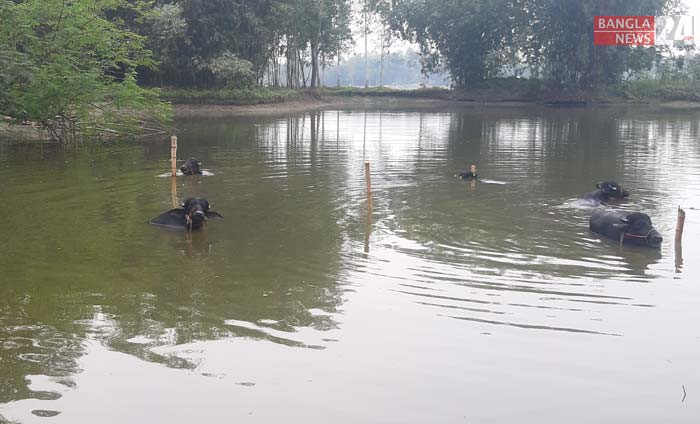 শীতকালেও মহিষগুলোকে পুকুরে বেঁধে রাখা হয়েছে। রাণীরবন্দর-পাকেরহাট সড়কের প্ল্যানের বাজার এলাকা থেকে ছবি তুলেছেন মো. আমিরুজ্জামান।