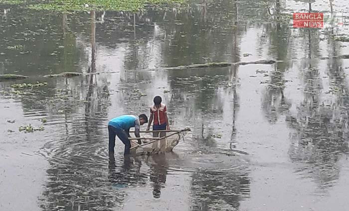 দিনাজপুরের খানসামা এলাকায় ইছামতি নদীতে এভাবে মাছ ধরছেন স্থানীয়রা। ছবি: মো. আমিরুজ্জামান