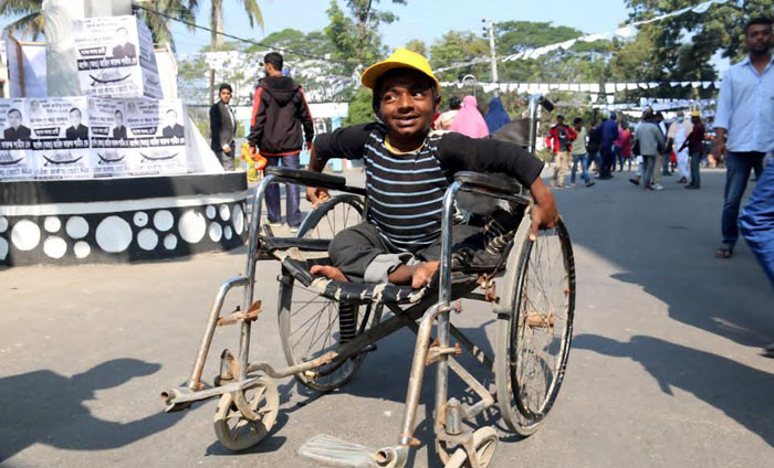 হুইল চেয়ারে করে বরিশালে প্রধানমন্ত্রীর জনসভাস্থলে রাকিব, ছবি: এন আমিন রাসেল