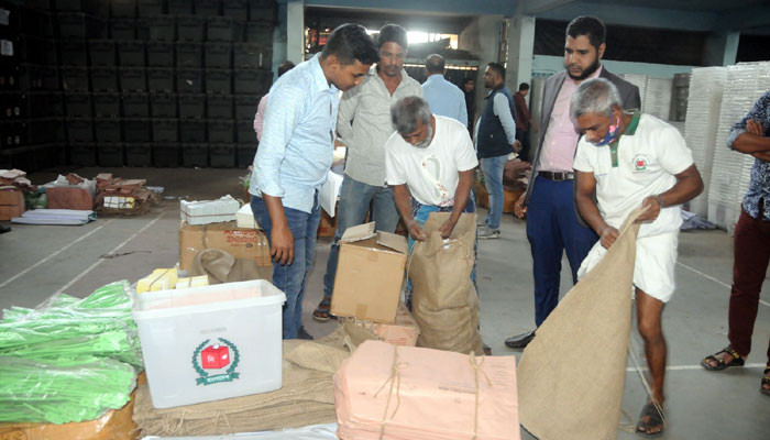বিভিন্ন কেন্দ্রে পাঠানো হচ্ছে নির্বাচনী সরঞ্জাম, চট্টগ্রামের এম এ আজিজ স্টেডিয়ামের জিমনেসিয়াম থেকে ছবিটি তুলেছেন সোহেল সরওয়ার