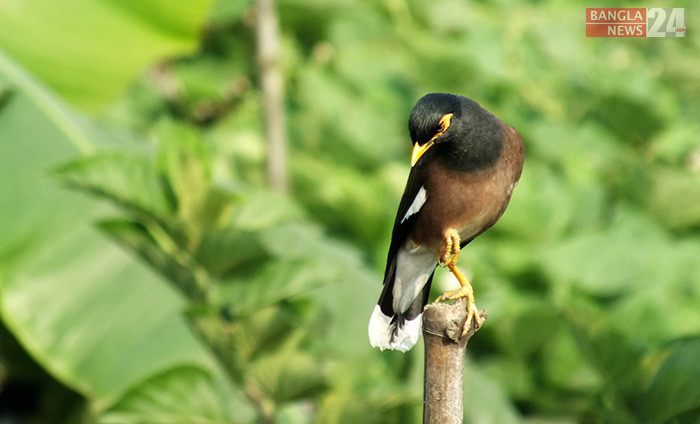 পৌষের কনকনে শীতে বাঁশের খুঁটিতে এক পায়ে দাড়িয়ে শালিক পাখি। পাবনার ঈশ্বরদী শহরের নবাব আলীবর্দি সড়ক থেকে ছবিটি তুলেছেন টিপু সুলতান।