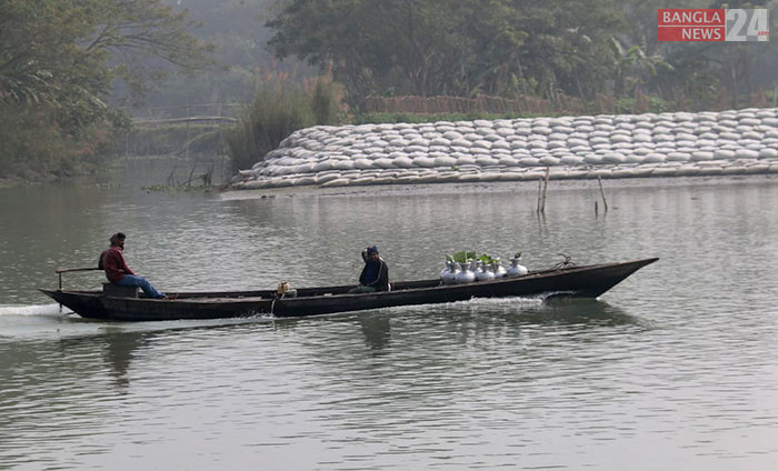 নদীপথে কলসভর্তি দুধ নিয়ে হাটে যাচ্ছেন খামারী। ছবি: এন আমিন রাসেল