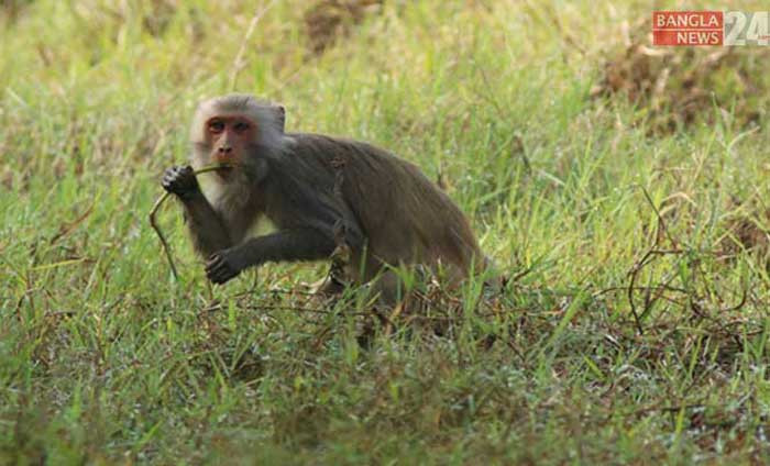 বানর ঘাস খেতে ব্যস্ত। ছবি: বিশ্বজিৎ ভট্টাচার্য বাপন