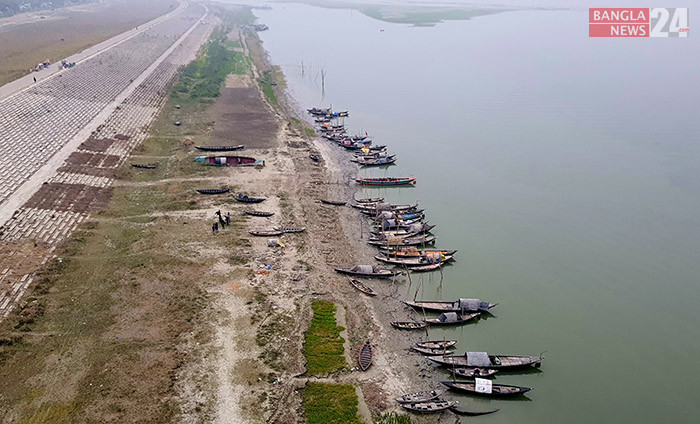 পদ্মা সেতুর নিচে শত শত ছোট নৌকার সারি। ছবি: জি এম মুজিবুর