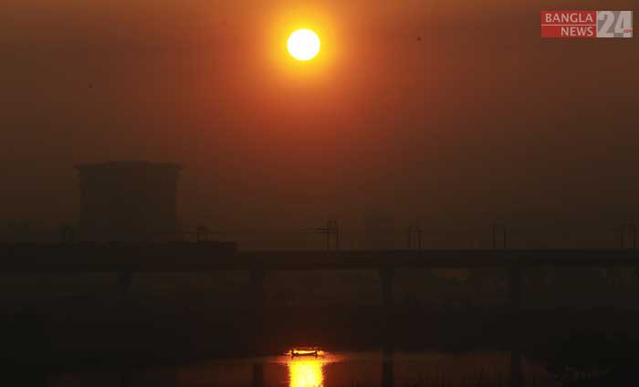 লাল রং ধারণ করে অস্ত যাচ্ছে সূর্য। রাজধানীর উত্তরা থেকে ছবি তুলেছেন রাজীন চৌধুরী