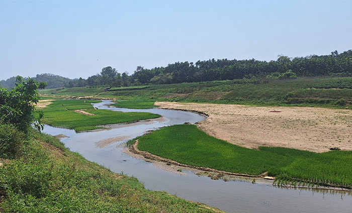 শুষ্ক মৌসুমে কক্সবাজারের খরস্রোতা বাঁকখালীর বুকে ধানের আবাদ। নদী শুকিয়ে পরিণত হয়েছে নালায়। ছবি- সুনীল বড়ুয়া।