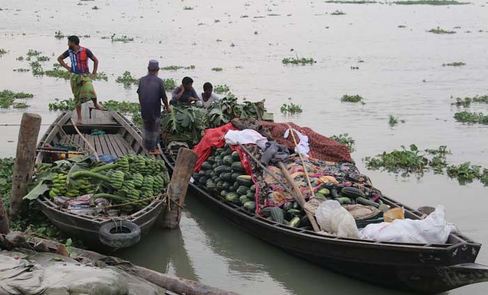 দখিনের বিভিন্ন এলাকা থেকে বাঙ্গি কিনে নদীপথে বাজারে নিয়ে এসেছেন ব্যবসায়ীরা, নেছারাবাদের সন্ধ্যা নদী থেকে ছবি তুলেছেন এন আমিন রাসেল।