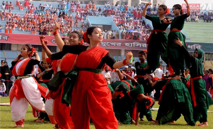 মহান স্বাধীনতা দিবস উপলক্ষে এমএ আজিজ স্টেডিয়ামে শিশু-কিশোরের লাল-সবুজে বর্ণিল ডিসপ্লে। ছবি: সোহেল সরওয়ার