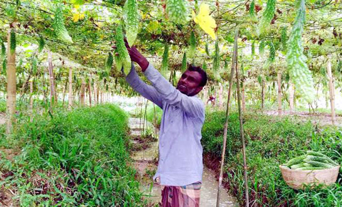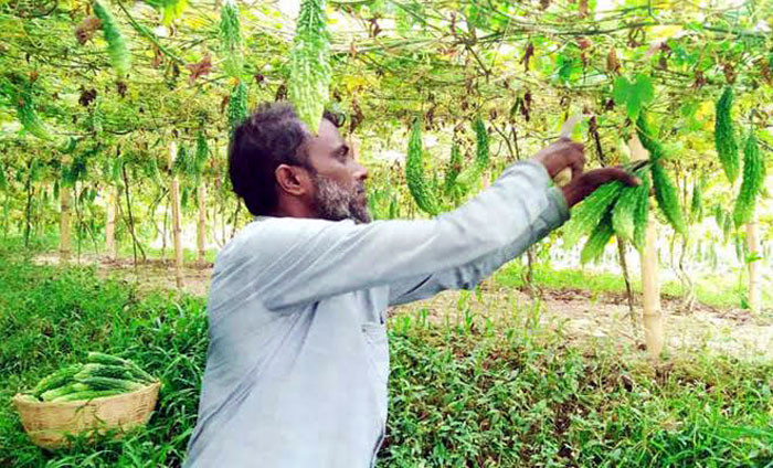 মাচাং থেকে করলা পাড়ছেন কৃষক, ছবি: বাংলানিউজ