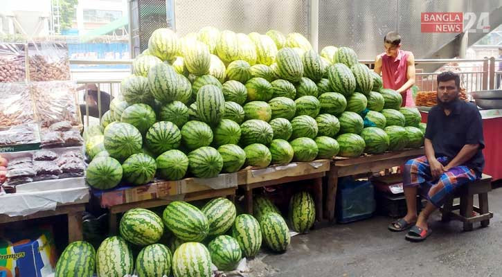 কয়েকদিন আগে চোখ রাঙানো তরমুজের দাম এখন নেমে এসেছে অর্ধেকে। কিন্তু সেই তুলানায় তরমুজ বিক্রি হচ্ছে না। ক্রেতার জন্য বসে আছেন তরমুজ বিক্রেতা। ছবি: বাংলানিউজ