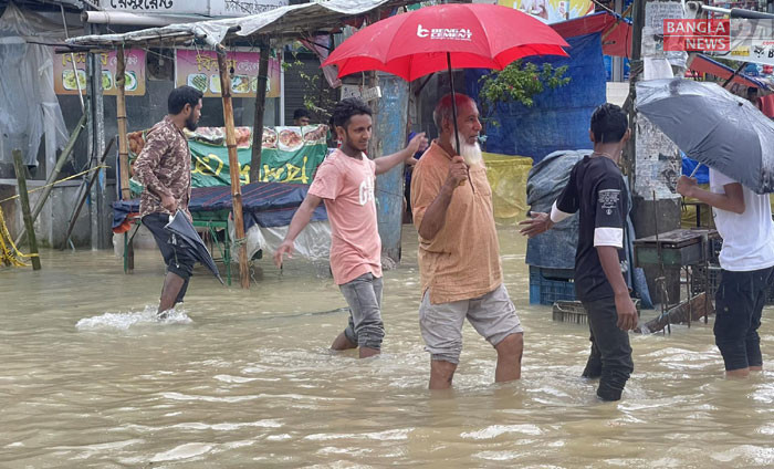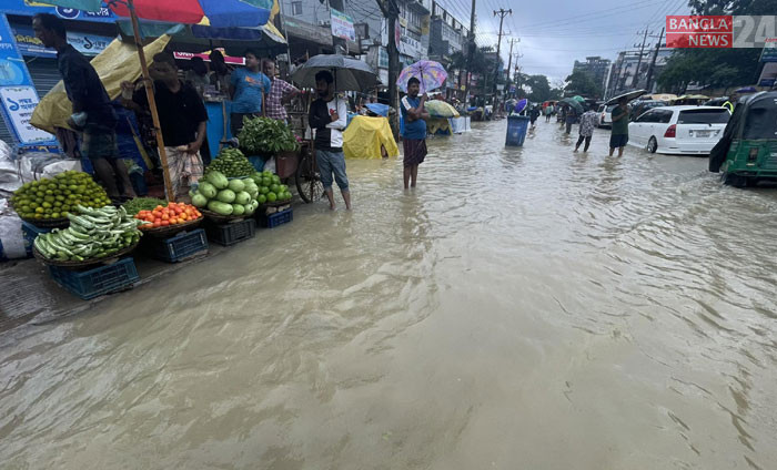 ভারী বর্ষণে মেজরটিলা এলাকায় রাস্তাঘাট ও দোকানপাট তলিয়ে গেছে। ছবি: মাহমুদ হোসেন