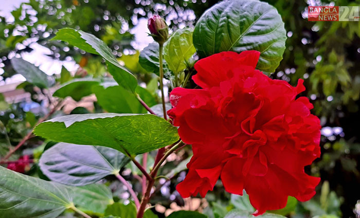 লাল জবা ফুলে রঙিন হয়ে আছে বাগান। ছবি: জি এম মুজিবুর