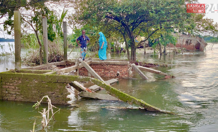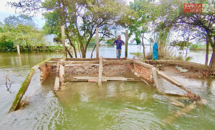 সিলেটের কোম্পানীগঞ্জ উপজেলার পিয়াইন নদীর পার্শ্ববর্তী বুড়দেও গ্রামে এভাবেই বন্যার পানিতে তলিয়ে যায় একটি ঘর। ছবি: মাহমুদ হোসেন