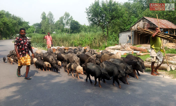 নীলফামারীর কিশোরগঞ্জ-তারাগঞ্জ সড়কে এক পাল শূকর চড়াচ্ছেন রাখাল। ছবি: আমিরুজ্জামান