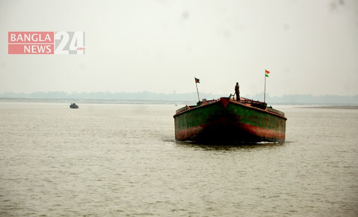 কুড়িগ্রামের চিলমারী নৌবন্দর হয়ে ব্রহ্মপুত্র নদে যাতায়াত করছে বাংলাদেশ-ভারতের পতাকাবাহী বুলগেট। ছবি: ফজলে এলাহী স্বপন