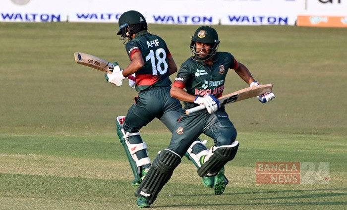 আফগানিস্তানের বিপক্ষে রেকর্ড জুটি গড়ে বাংলাদেশকে অবিশ্বাস্য জয় এনে দিলেন আফিফ হোসেন ও মেহেদী হাসান মিরাজ। চট্টগ্রামের জহুর আহমেদ চৌধুরী স্টেডিয়াম থেকে ছবি তুলেছেন উজ্জ্বল ধর