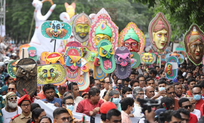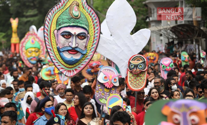 দুই বছর পর পহেলা বৈশাখে টিএসসি থেকে বের হয় মঙ্গল শোভাযাত্রা। ছবি: ডিএইচ বাদল