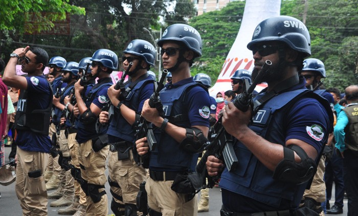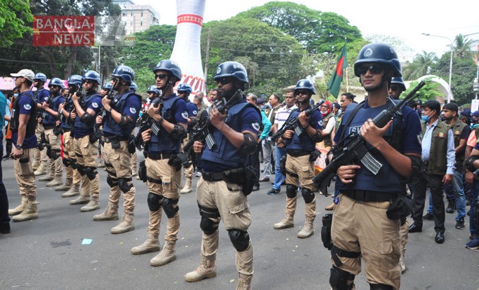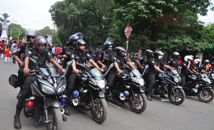 পহেলা বৈশাখের অনুষ্ঠানস্থল ও টিএসসিসহ পুরো ক্যাম্পাস এলাকায় কঠোর নিরাপত্তাব্যবস্থা জোরদার করা হয়েছে। মোতায়েন আছেন আইনশৃঙ্খলা রক্ষাকারী বাহিনীর বিপুলসংখ্যক সদস্য। ছবি: ডিএইচ বাদল