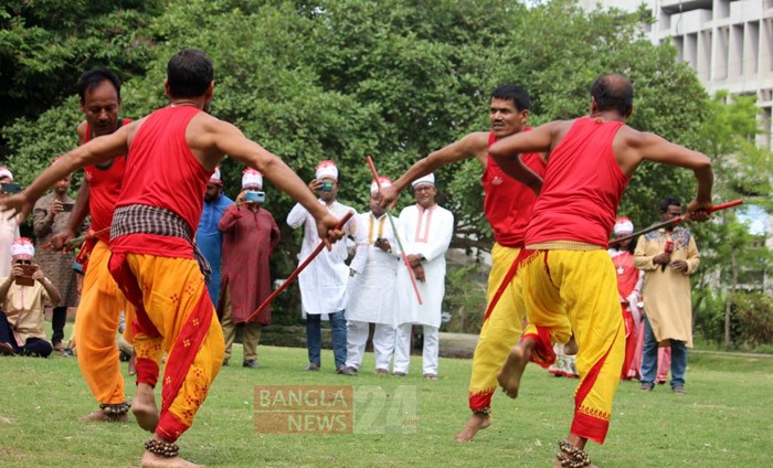 বাংলা নববর্ষ উপলক্ষে খুলনা বিশ্ববিদ্যালয়ে গ্রাম বাংলার ঐতিহ্যবাহী লাঠি খেলা দেখে মুগ্ধ সবাই। ছবি: মাহবুবুর রহমান মুন্না
