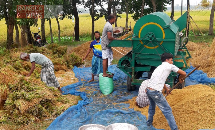 মেশিনে চলছে বোরো ধান মাড়াইয়ের কাজ। ছবিটি নীলফামারীর সংগলশী থেকে তুলেছেন আমিরুজ্জামান।