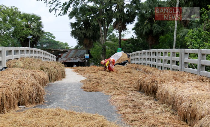 বৃষ্টিতে ভেজা ধান শুকানোর জন্য ব্রিজের ওপর রাখা হয়েছে। ছবি: এন আমিন রাসেল