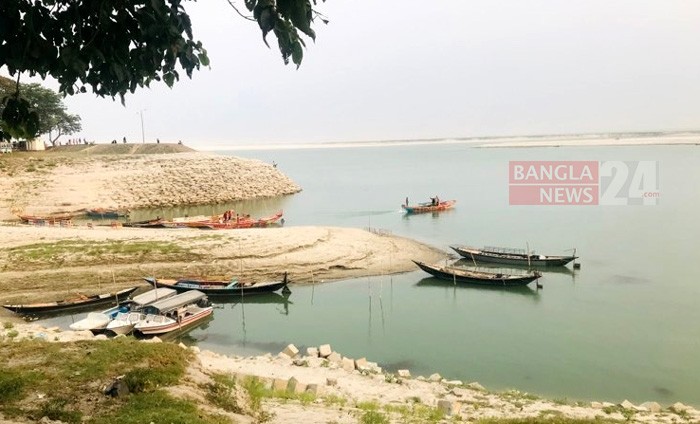 যাত্রীর অপেক্ষায় পদ্মা পাড়ে নৌকার সারি। ছবি: ফারিয়ার শোভন