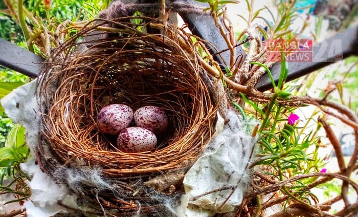 যান্ত্রিক শহরে ফ্ল্যাটের বারান্দায় ঘর বেঁধেছে বুলবুলি পাখি। ছবি: রেহ্নুমা লাবিবা