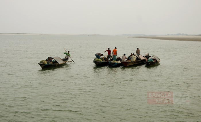 ছোট ছোট ডিঙি নৌকায় বসে মাছ ধরায় ব্যস্ত জেলেরা। ছবিটি কুড়িগ্রামের ব্রহ্মপুত্র নদ থেকে তুলেছেন ফজলে ইলাহী স্বপন