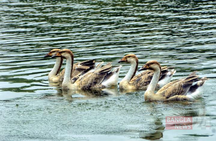 তীব্র গরমে রাজধানীর সোহরাওয়ার্দী উদ্যানের লেকে ভেসে বেড়াচ্ছে কয়েক জোড়া রাজহাঁস। ছবি: ডিএইচ বাদল
