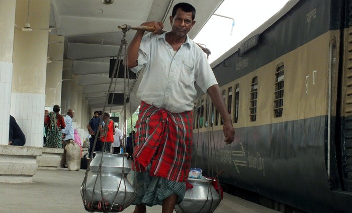 হাঁকডাক দিয়ে ঘোল বিক্রি করছেন ফেরিওয়ালা। ছবিটি রাজশাহী রেল স্টেশন থেকে তুলেছেন টিপু সুলতান।