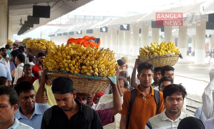 মাথায় করে কলা নিয়ে গ্রাম থেকে শহরে যাচ্ছেন বিক্রেতারা। ছবিটি রাজশাহী রেল স্টেশন থেকে তুলেছেন টিপু সুলতান।