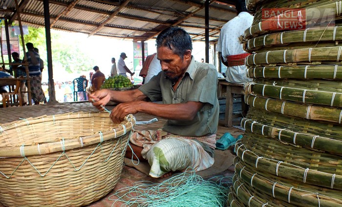 আম রাখার জন্য ডালা তৈরি করছেন ডালা বিক্রেতা। ছবিটি রহনপুরের গোমস্তাপুর থেকে তুলেছেন টিপু সুলতান।