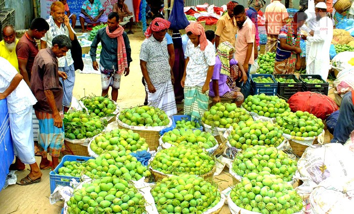 বিক্রির জন্য ব্যস্ত হয়ে উঠেছে গোমস্তাপুরের আমের হাঁট। ছবিটি রহনপুর থেকে তুলেছেন টিপু সুলতান।