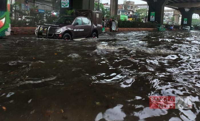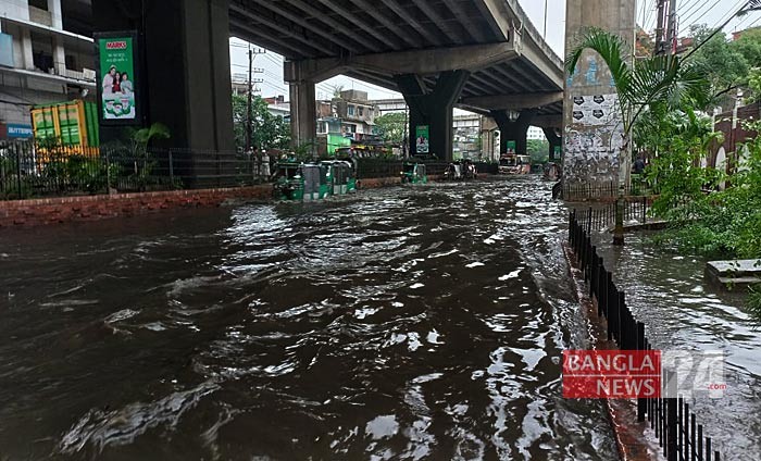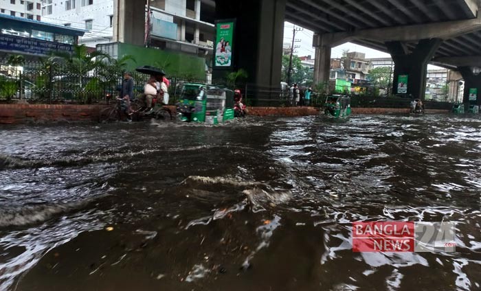 বৃষ্টিতে নর্দমার ময়লা পানি উপচে সড়কে আটকে ভোগান্তিতে মানুষজন। চট্টগ্রাম নগরীর ২ নম্বর গেট এলাকার প্রধান সড়কের ছবিটি তুলেছেন উজ্জ্বল ধর।