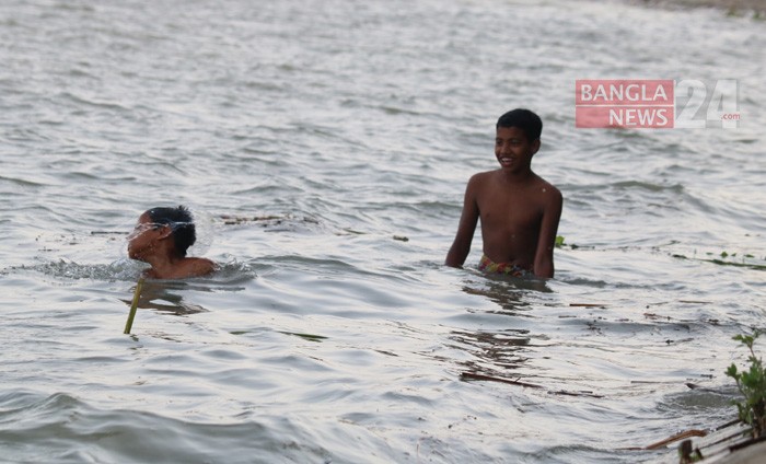 তীব্র গরমে প্রশান্তির খোঁজে কীর্তনখোলা নদীতে গোসল করছে শিশুরা। ছবি: আদনান অলি
