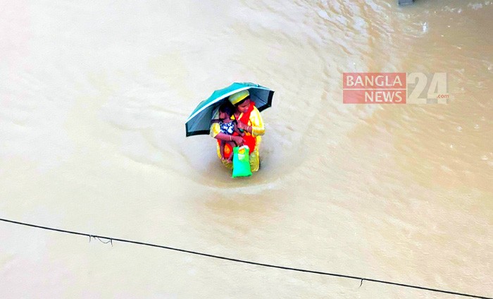 সিলেটে নিরাপদ আশ্রয়ের খোঁজে ছুটছেন বন্যার্ত মানুষ। ছবি: মাহমুদ হোসেন