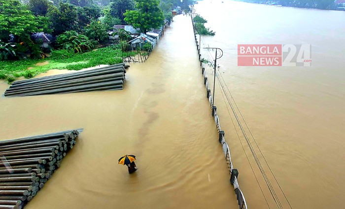 টানা বৃষ্টিপাতের ফলে সিলেটের বন্যা পরিস্থিতি আরও ভয়াবহ হচ্ছে। ছবি: মাহমুদ হোসেন